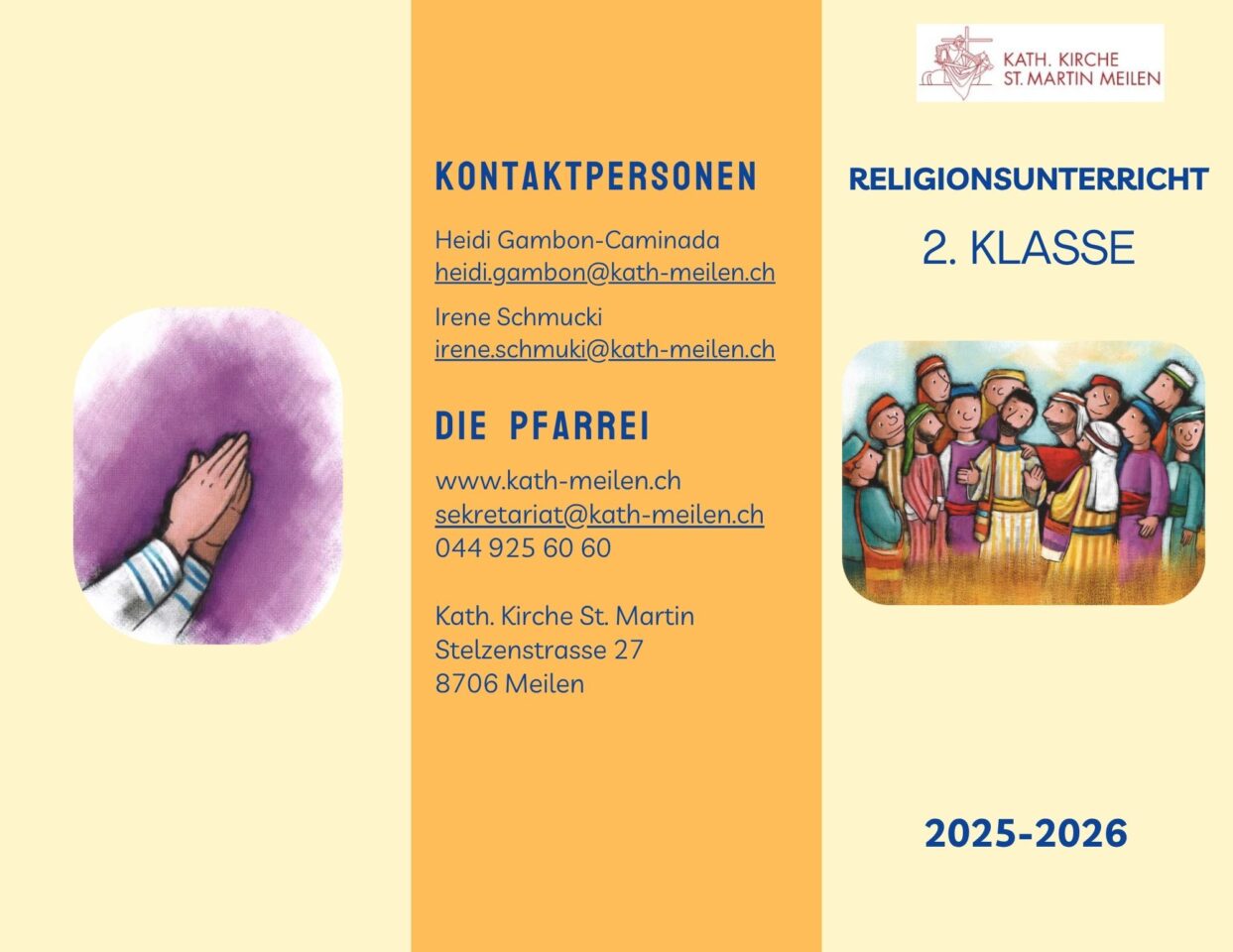 Kath. Meilen |Angebot|Religionsunterricht|2. Klasse 2. Klasse Zum Öffnen bitte auf den Flyer klicken Kontakt Heidi Gambon-Caminada Katechetin E-Mail Irene Schmucki Katechetin E-Mail Nächste Anlässe Mittwoch4Februar 13.15–14.45 Uhr RU 2. Klasse Martinszentrum Mittwoch4März 13.15–14.45 Uhr RU 2. Klasse Martinszentrum Sonntag8März 11.00–12.00 Uhr Ökum. Chinderfiir Martinszentrum Samstag21März 16.00–17.00 Uhr Familiengottesdienst mit Tauferneuerung für die Kinder der 3. Klasse Kath. Kirche St. Martin Samstag28März 10.00–11.00 Uhr RU 2. Klasse mit Palmbinden Martinszentrum Sonntag29März 10.30–12.00 Uhr Chinderfiir Martinszentrum Mittwoch15April 13.15–14.45 Uhr RU 2. Klasse Martinszentrum Mittwoch20Mai 13.15–14.45 Uhr RU 2. Klasse Martinszentrum Mittwoch17Juni 13.15–14.45 Uhr RU 2. Klasse Martinszentrum Sonntag5Juli 10.30–11.30 Uhr Feier 75 Jahre Kirche St. Martin mit Schulschluss-Gottesdienst Kath. Kirche St. Martin Sonntag6September 10.30–11.30 Uhr Schuleröffnungsgottesdienst, anschl. Apéro Kath. Kirche St. Martin Samstag7November 16.00–17.00 Uhr Familiengottesdienst mit Laterneneinzug Vorabend Martinsfest Kath. Kirche St. Martin Mittwoch2Dezember 6.30–7.30 Uhr Rorate mit Zmorgen Kath. Kirche St. Martin